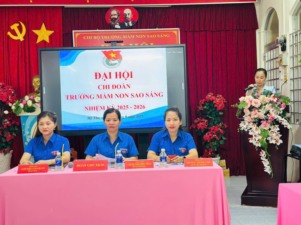 Đoàn trường Mẫu Giáo Sao Sáng được thành lập từ năm 1986. Khi mới thành lập, Đoàn trường chỉ có 6 đồng chí, dần dần số lượng đoàn viên tăng dần theo các nhiệm kỳ. Đến nay, Chi đoàn Trường Mầm non Sao Sáng là tổ chức đoàn cơ sở trực thuộc Đoàn phường Mỹ Tho, quy tụ 11 đoàn viên trẻ, năng động và giàu nhiệt huyết. Với đặc thù là đơn vị giáo dục mầm non, Chi đoàn luôn phát huy tinh thần tiên phong, gương mẫu, sáng tạo trong mọi hoạt động chuyên môn và phong trào thanh niên.