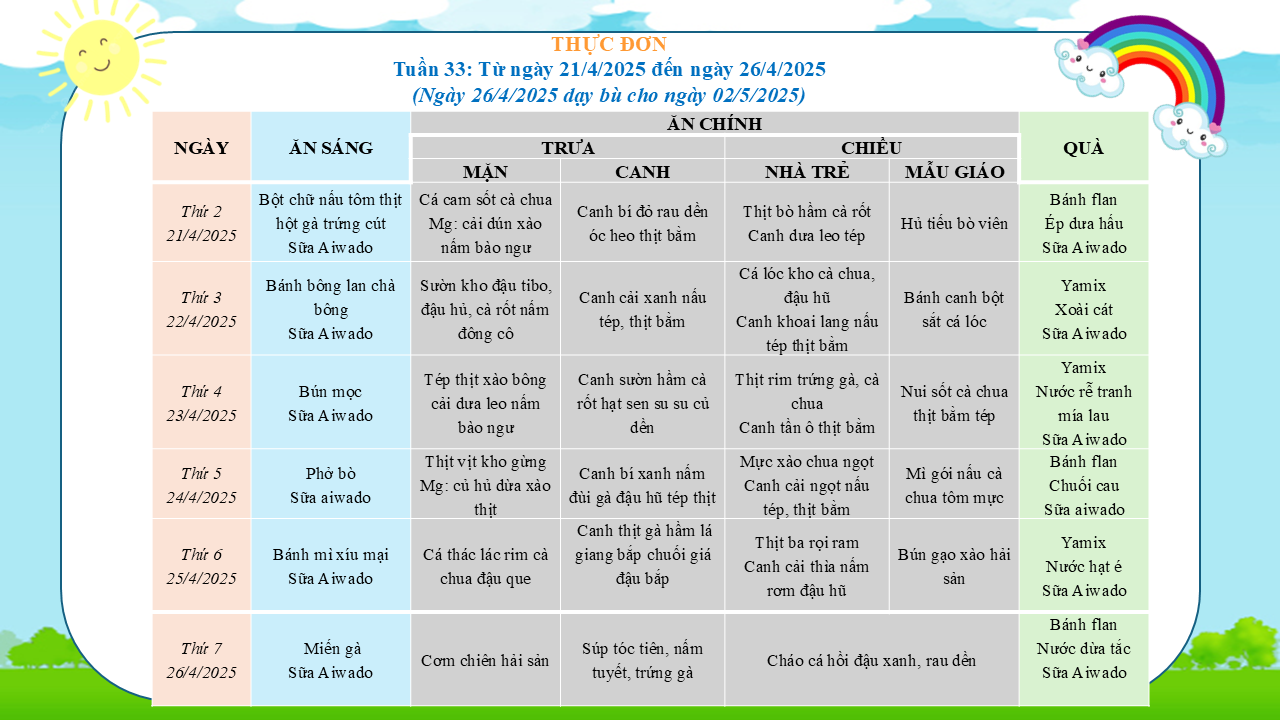 THỰC ĐƠN TUẦN 13 (Từ ngày 24/11/2025 - 28/11/2025)